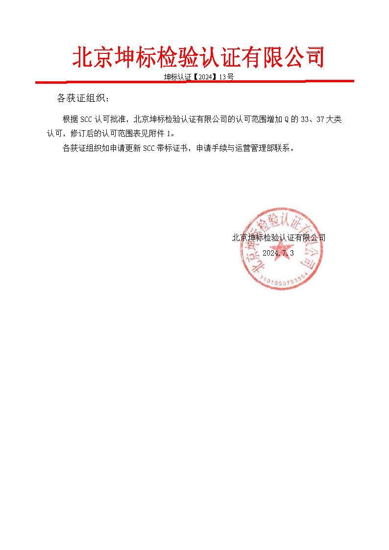 根據SCC認可批準,北京坤標檢驗認證有限公司的認可范圍增加Q的33、37大類認可,修訂后的認可范圍表見附件1。